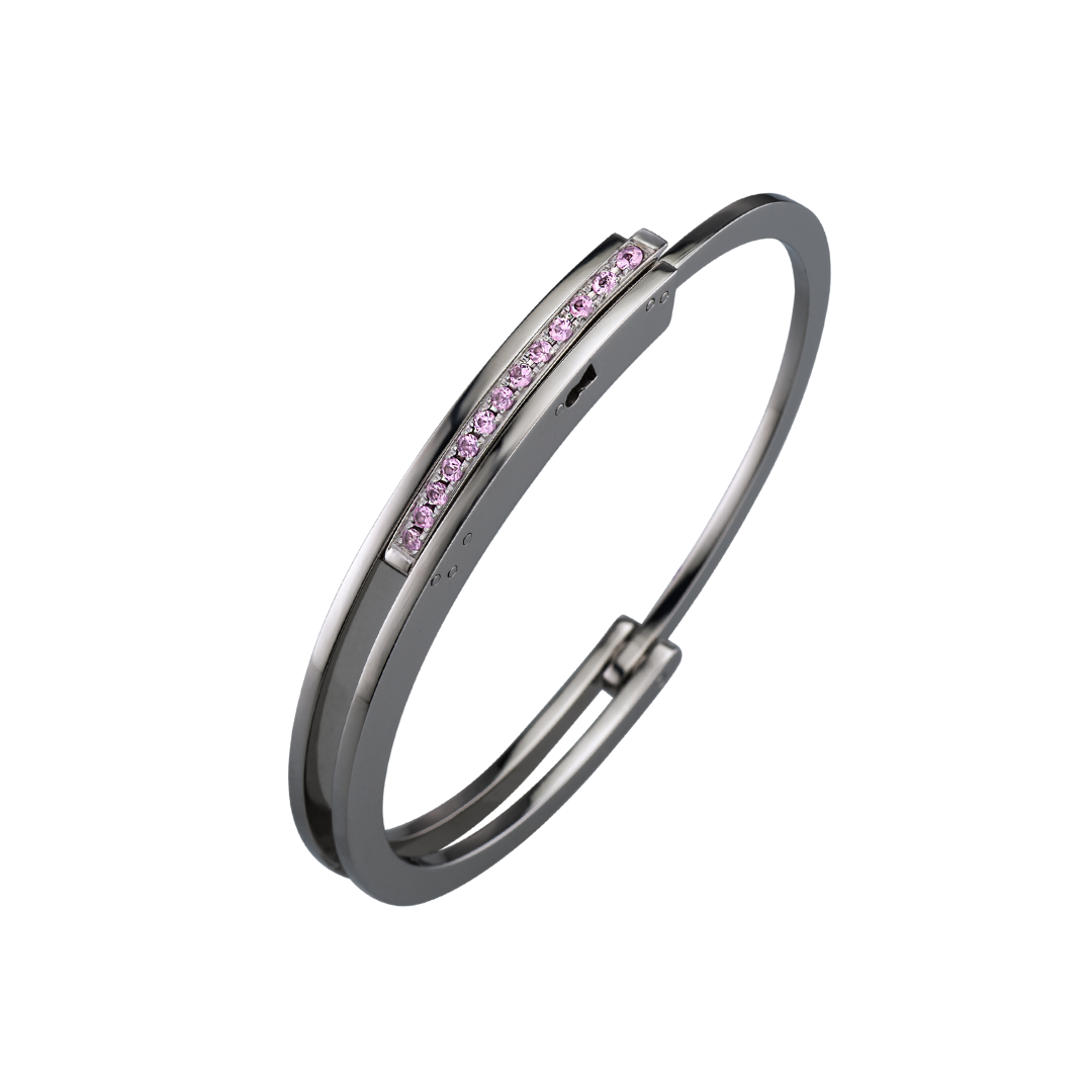 Bracciale ForOne ForTwo – POP Collection con fianchi e arco dentato in acciaio 316L chirurgico anallergico lucido, trattato in PVD gun-metal con cover lucida completa di tredici zaffiri naturali di colore pink.