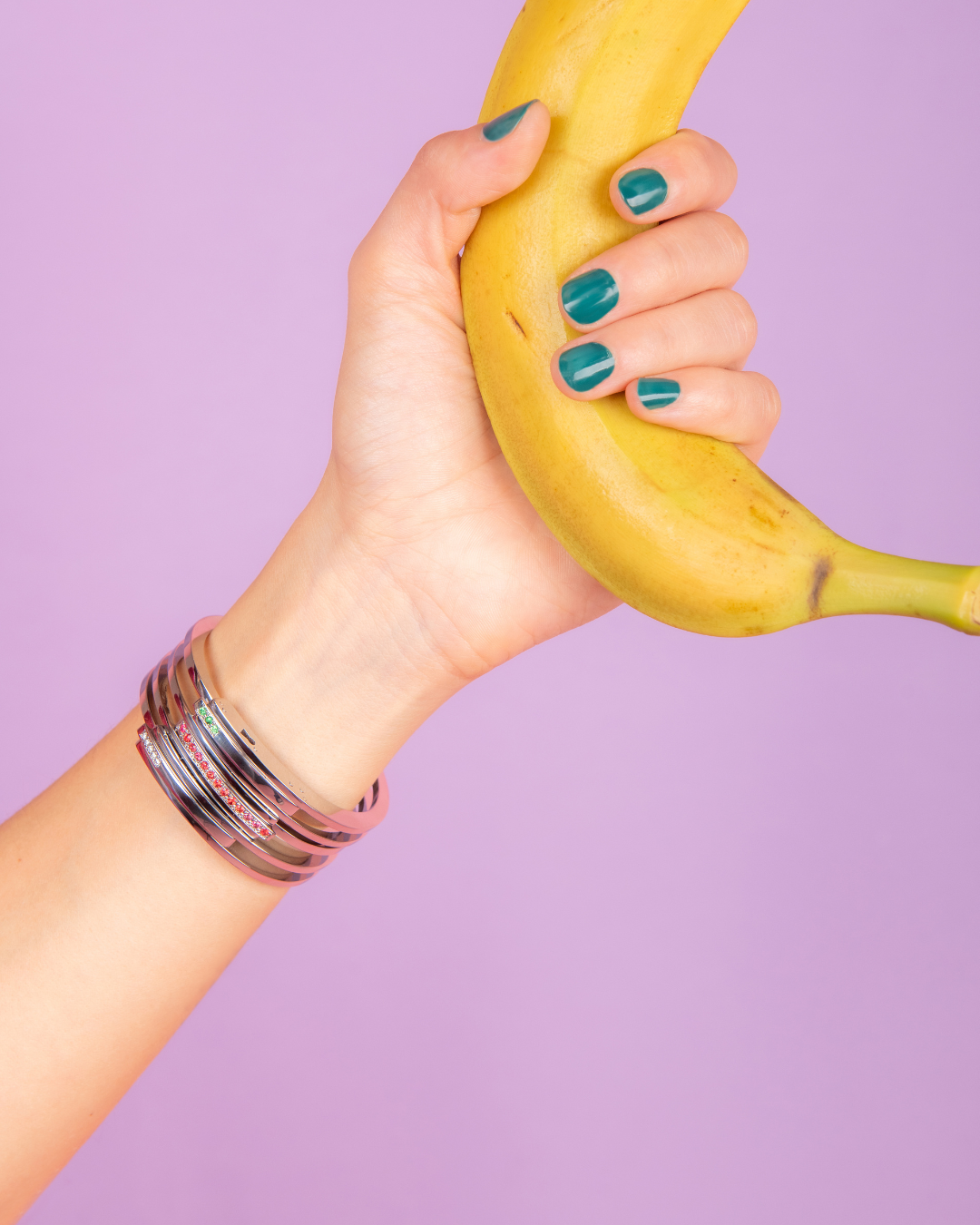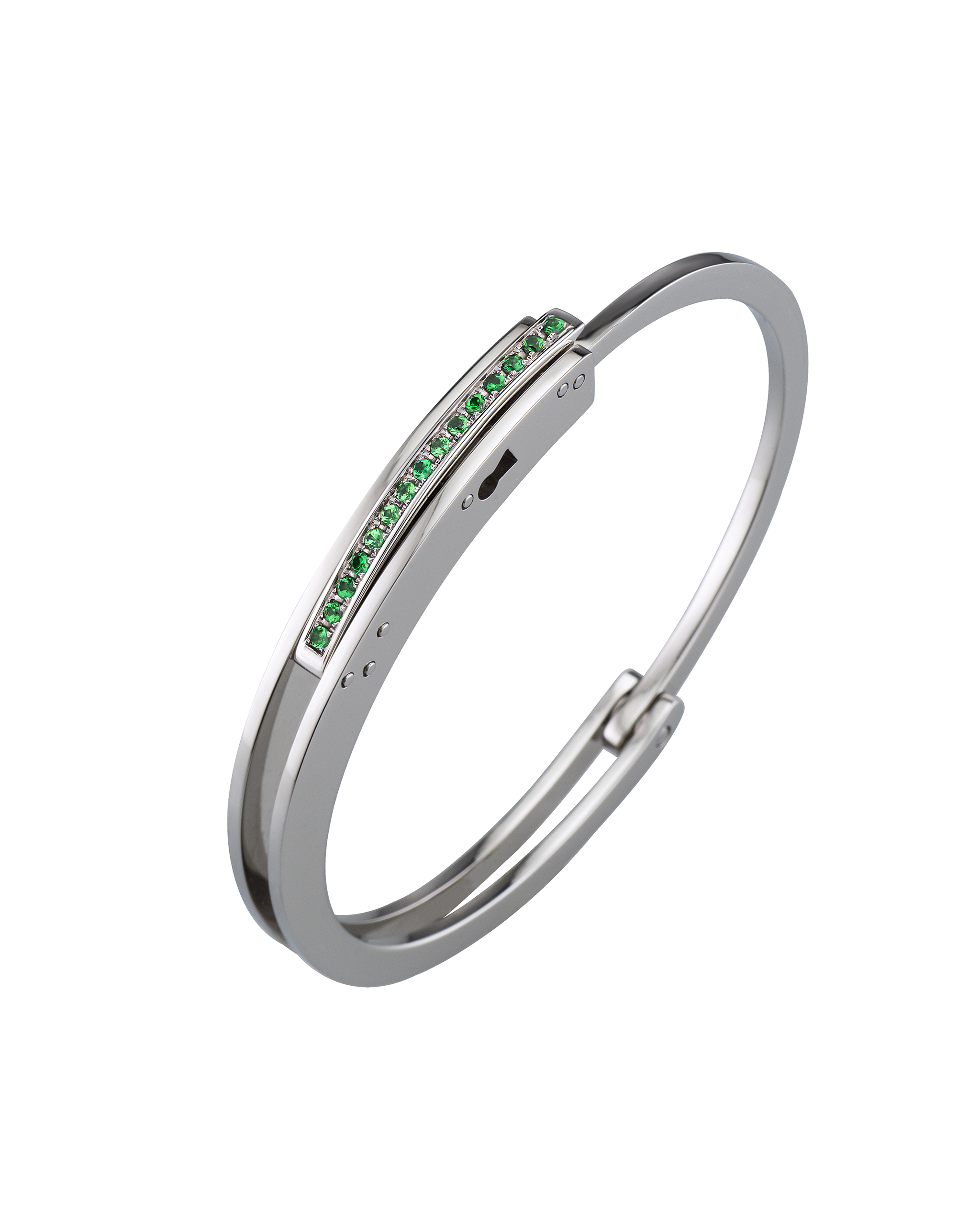 Bracciale ForOne ForTwo – POP Collection con fianchi e arco dentato in acciaio 316L chirurgico anallergico lucido, cover lucida completa di quindici tsavoriti naturali di colore green.