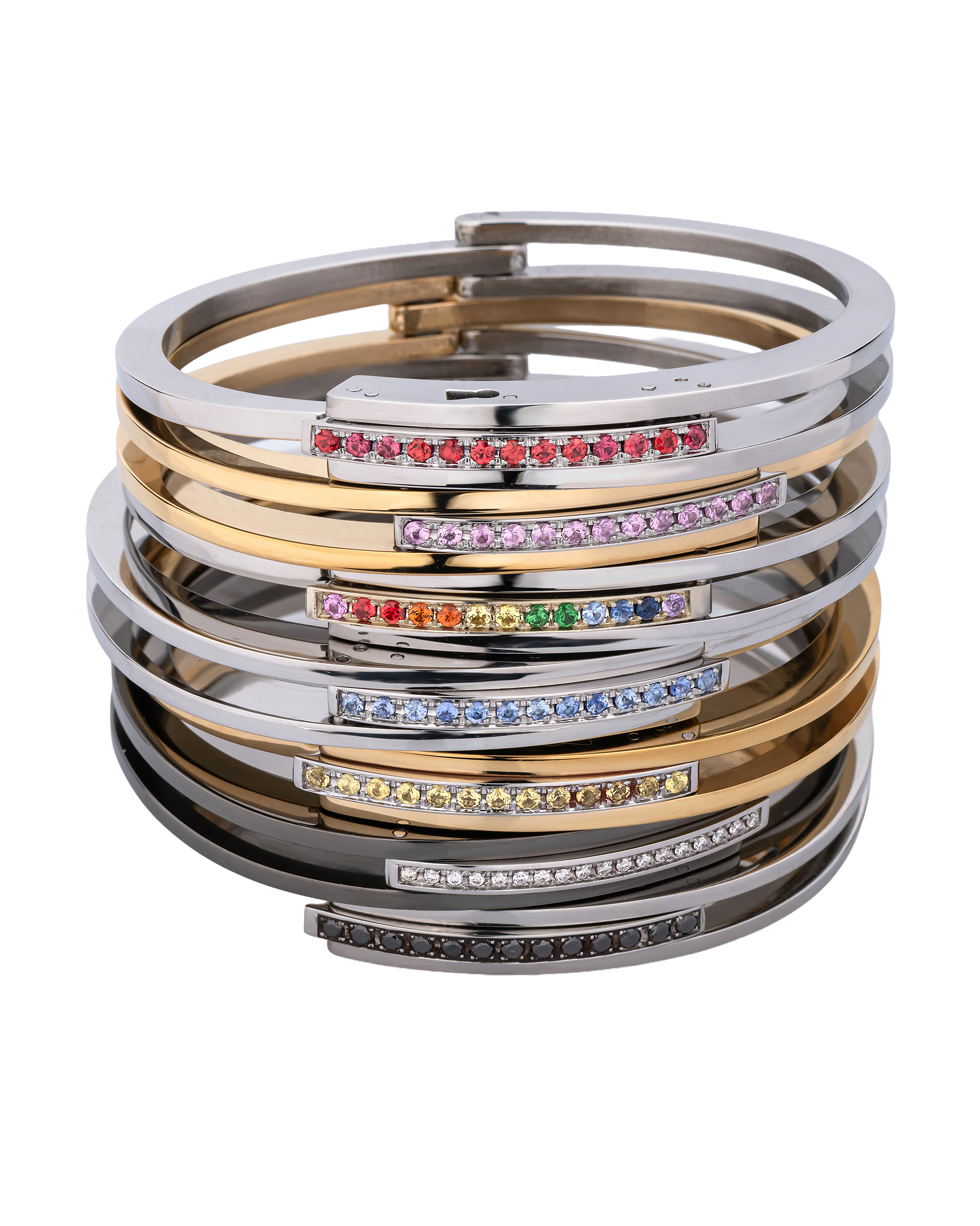Dall’incontro fra l’innovazione tecnologica e la maestria artigianale nasce ForOne ForTwo: un bracciale realizzato interamente a mano secondo l’eccellenza orafa di Valenza, emblema del più autentico Made in Italy. La chiusura esclusiva e brevettata, regolabile a scatti, rende ForOne ForTwo un bracciale rigido unico, capace di adattarsi perfettamente alla misura del polso.