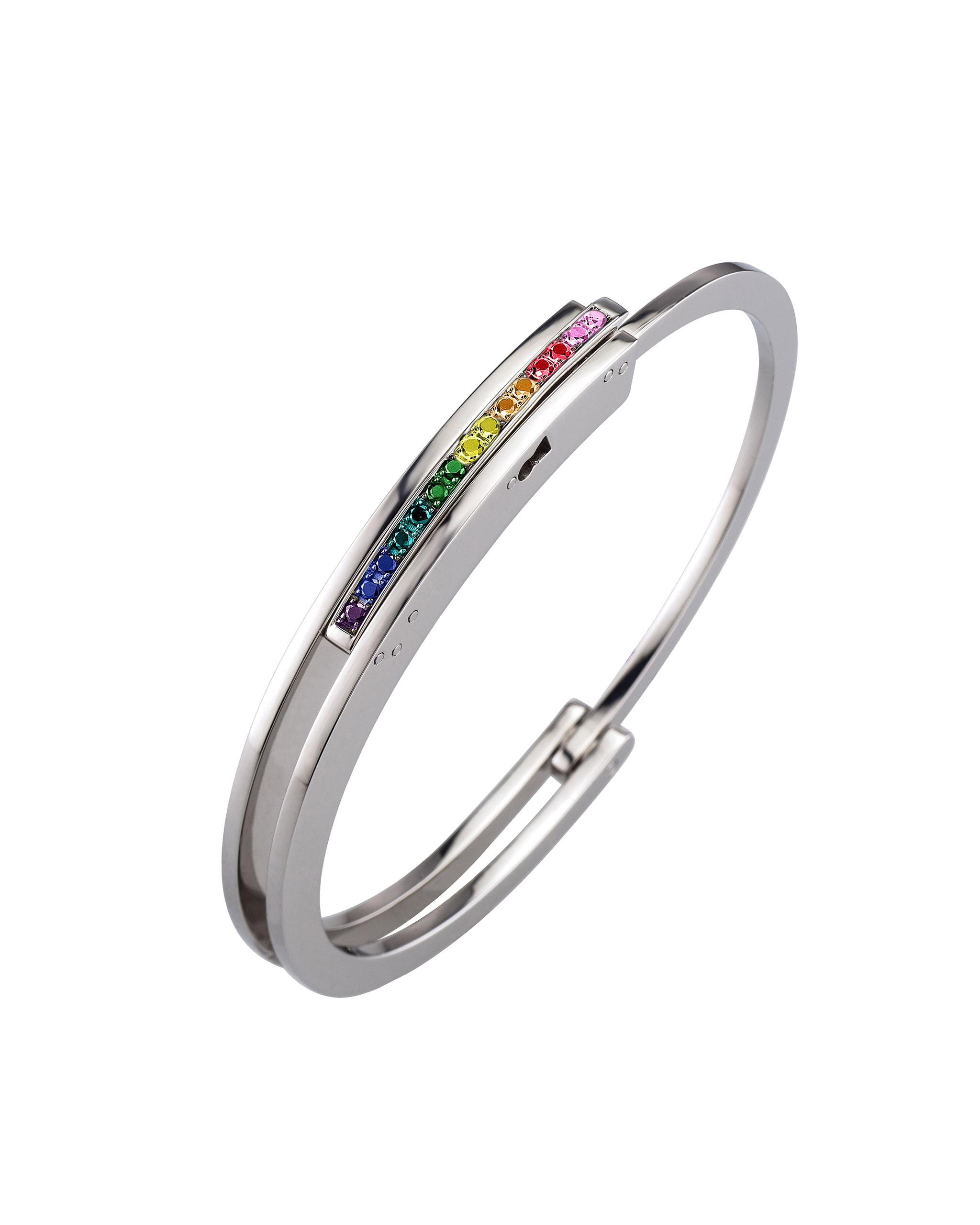 Bracciale ForOne ForTwo – POP Collection con fianchi e arco dentato in acciaio 316L chirurgico anallergico lucido, cover lucida completa di quindici zaffiri naturali di colori rainbow.