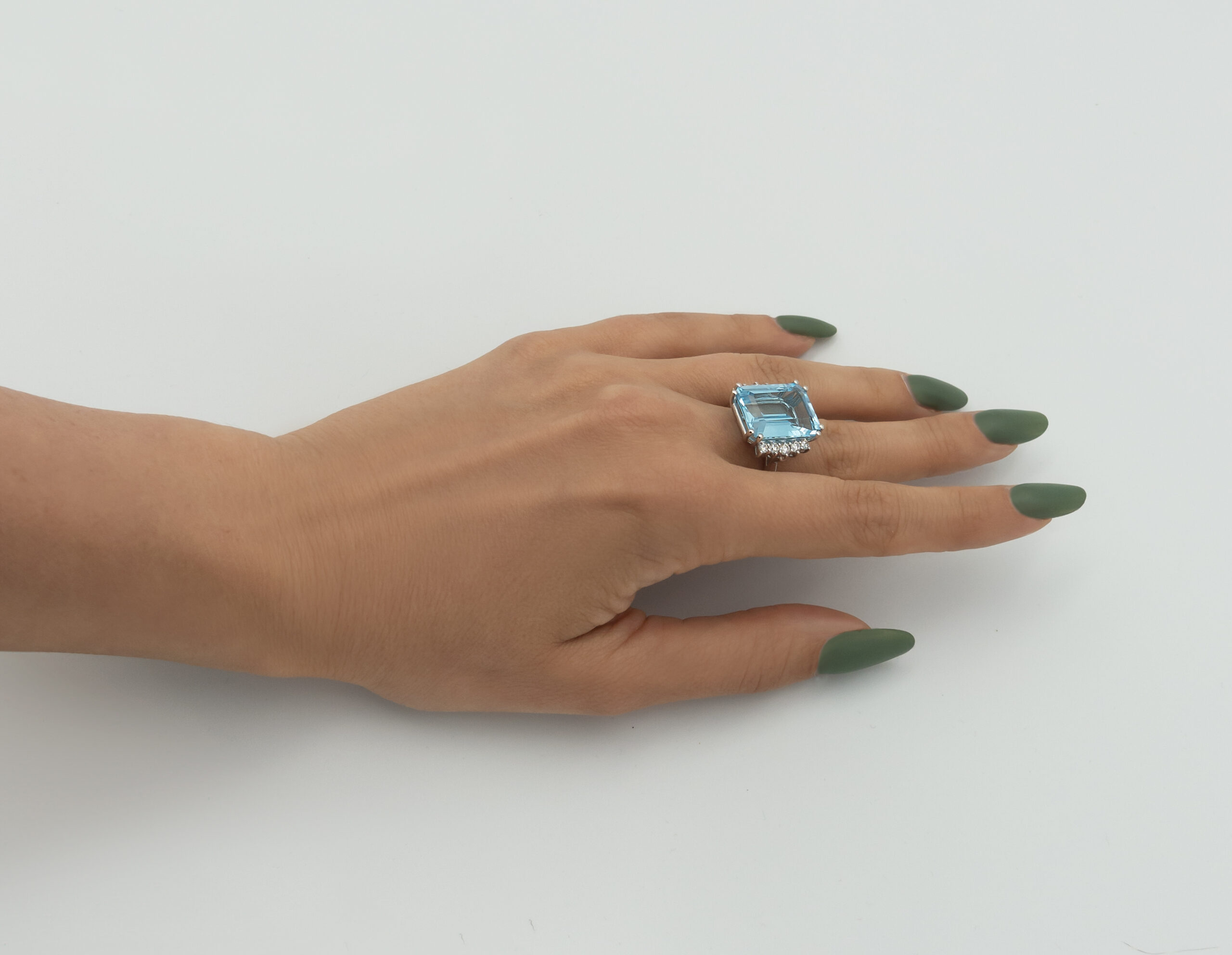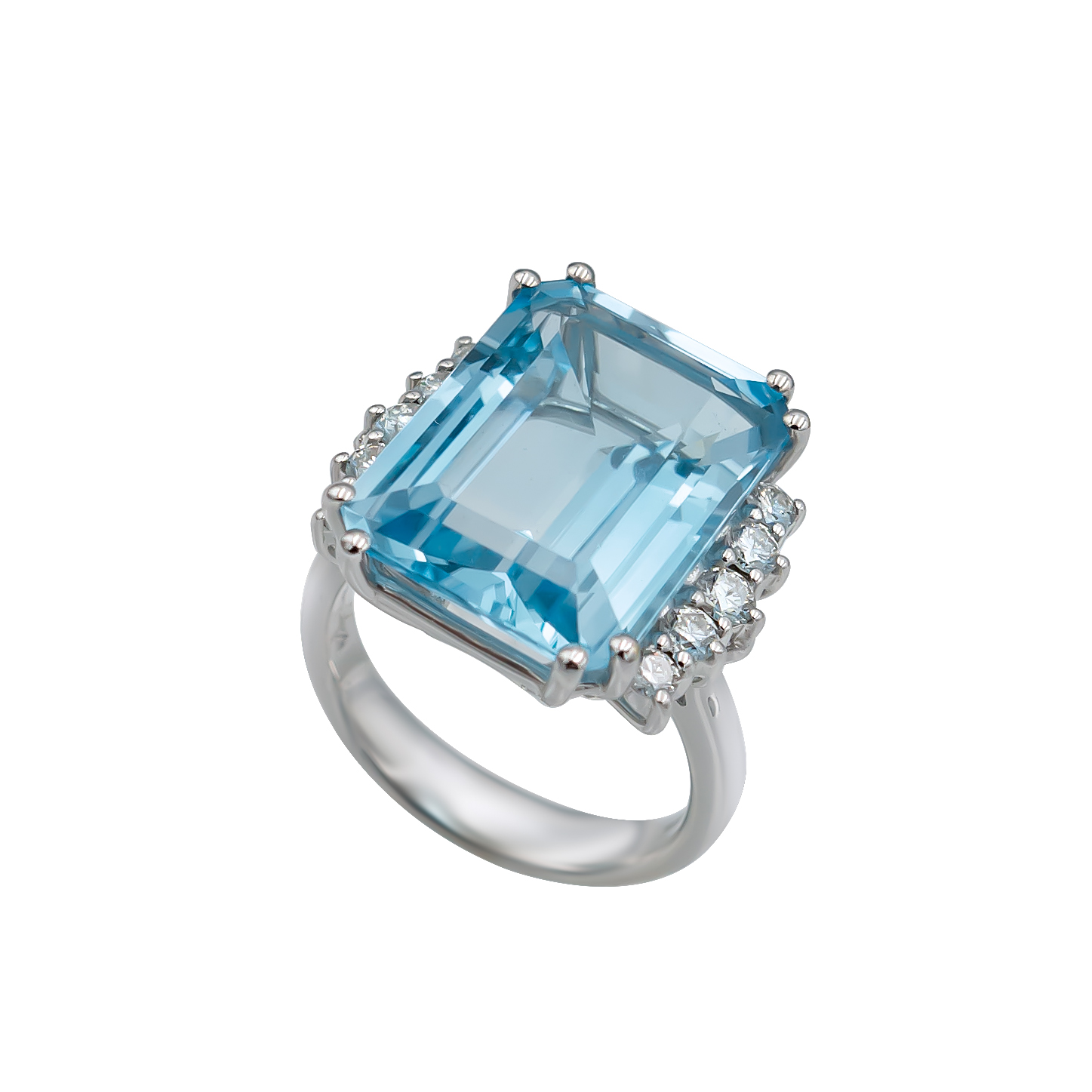 18 kt white gold ring starring a magnificent 17 carat natural emerald-cut blue topaz, framed by an essential and elegant design that enhances its extraordinary brilliance. On the sides, precious natural brilliant-cut G colour diamonds totalling 0.59 ct create a refined contrast that amplifies the chromatic purity and brilliance of the central gem.