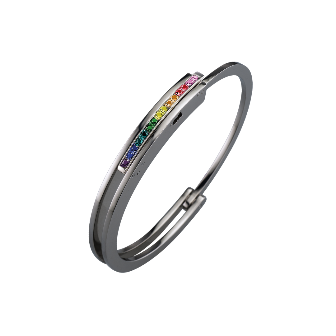 Bracciale ForOne ForTwo – POP Collection con fianchi e arco dentato in acciaio 316L chirurgico anallergico lucido, trattato in PVD gun-metal. Cover lucida interamente incastonata con zaffiri naturali multicolor e tsavoriti.